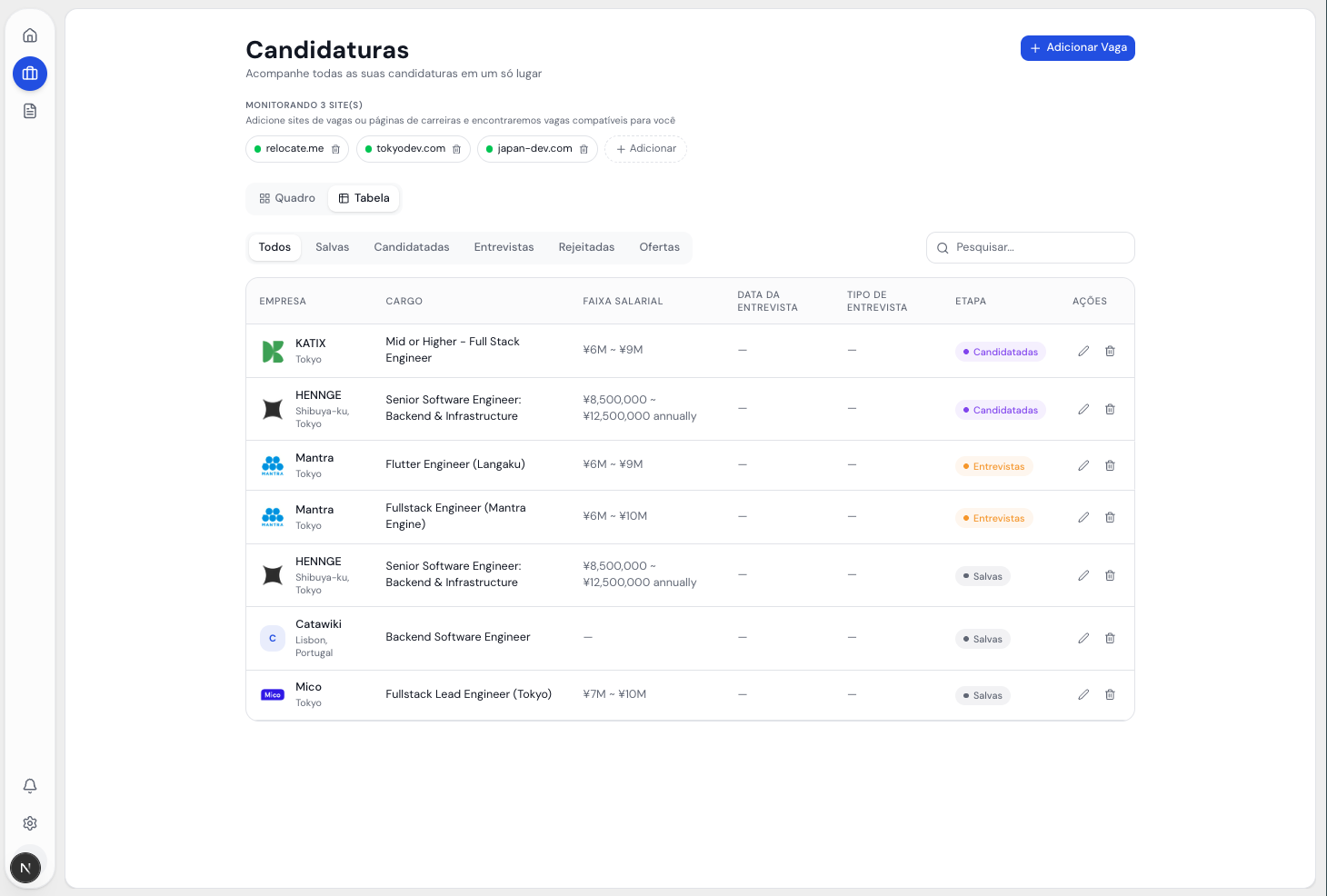 Gerencie cada candidatura com um pipeline visual do salvamento à oferta.